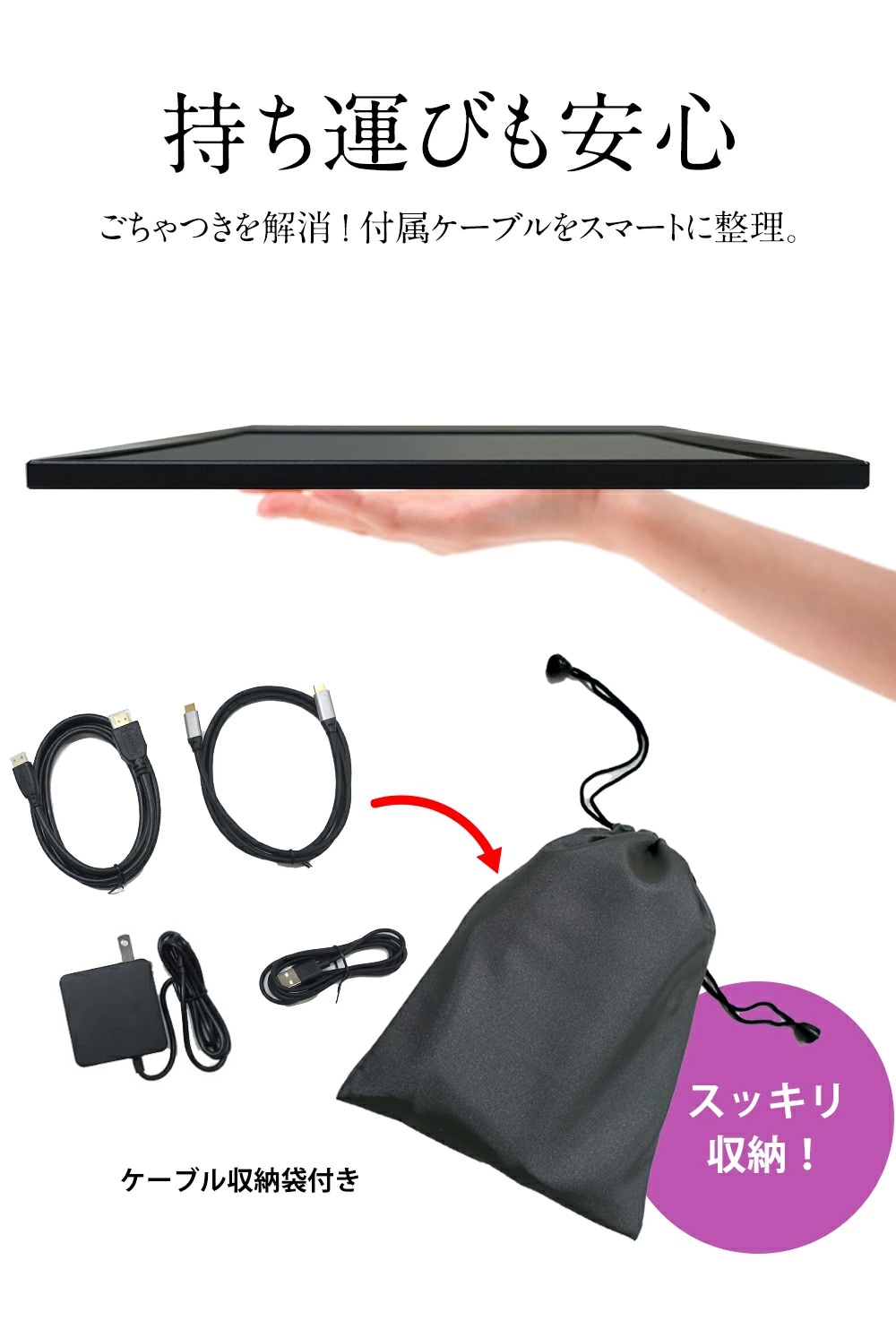 付属品:USBタイプCケーブル、USBタイプA-USBタイプCケーブル、HDMI-ミニHDMIケーブル、USBタイプCアダプターケーブル、ケーブル収納袋、取扱説明書(保証書付き)