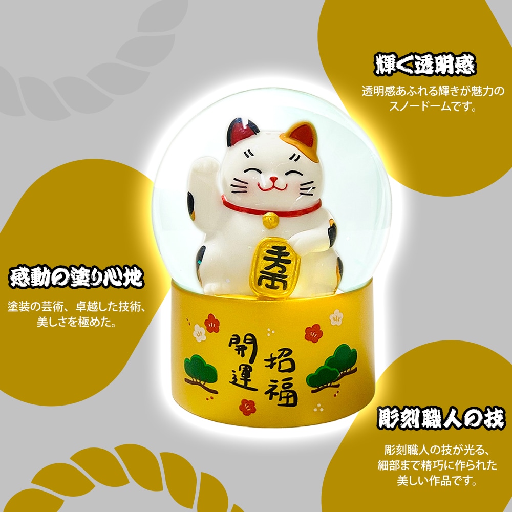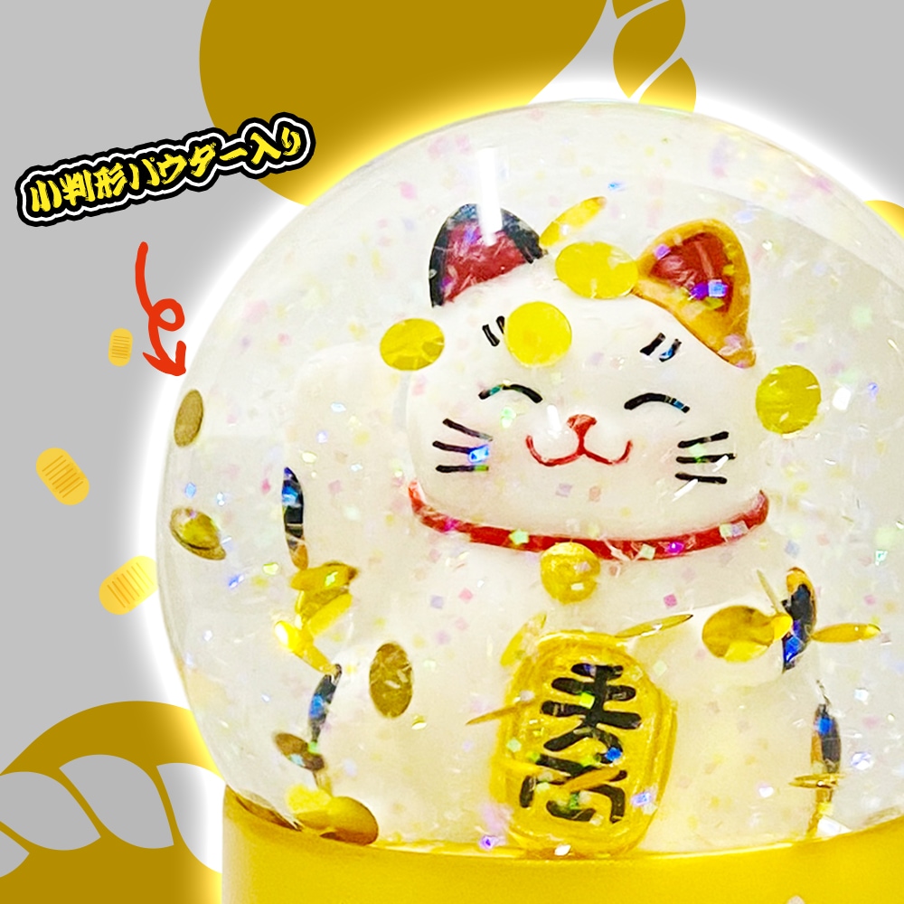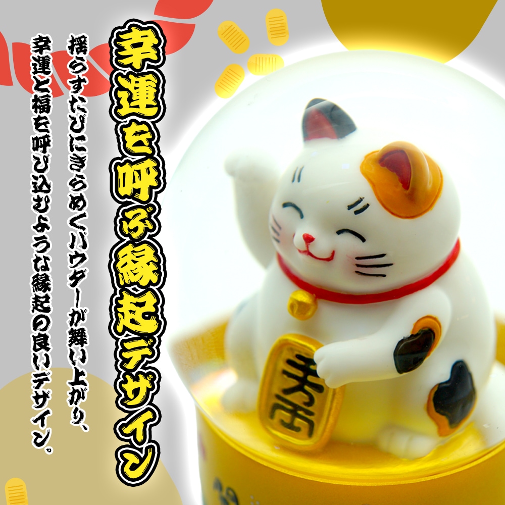 本商品は、小判を抱えた愛らしい招き猫と、金色の“小判型パウダー”が舞う、縁起の良いデザインのスノードームです。揺らすたびにきらめくパウダーが広がり、幸運と福を呼び込むような縁起の良いデザインです。