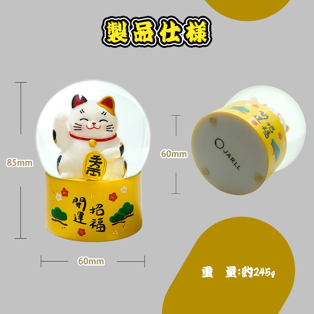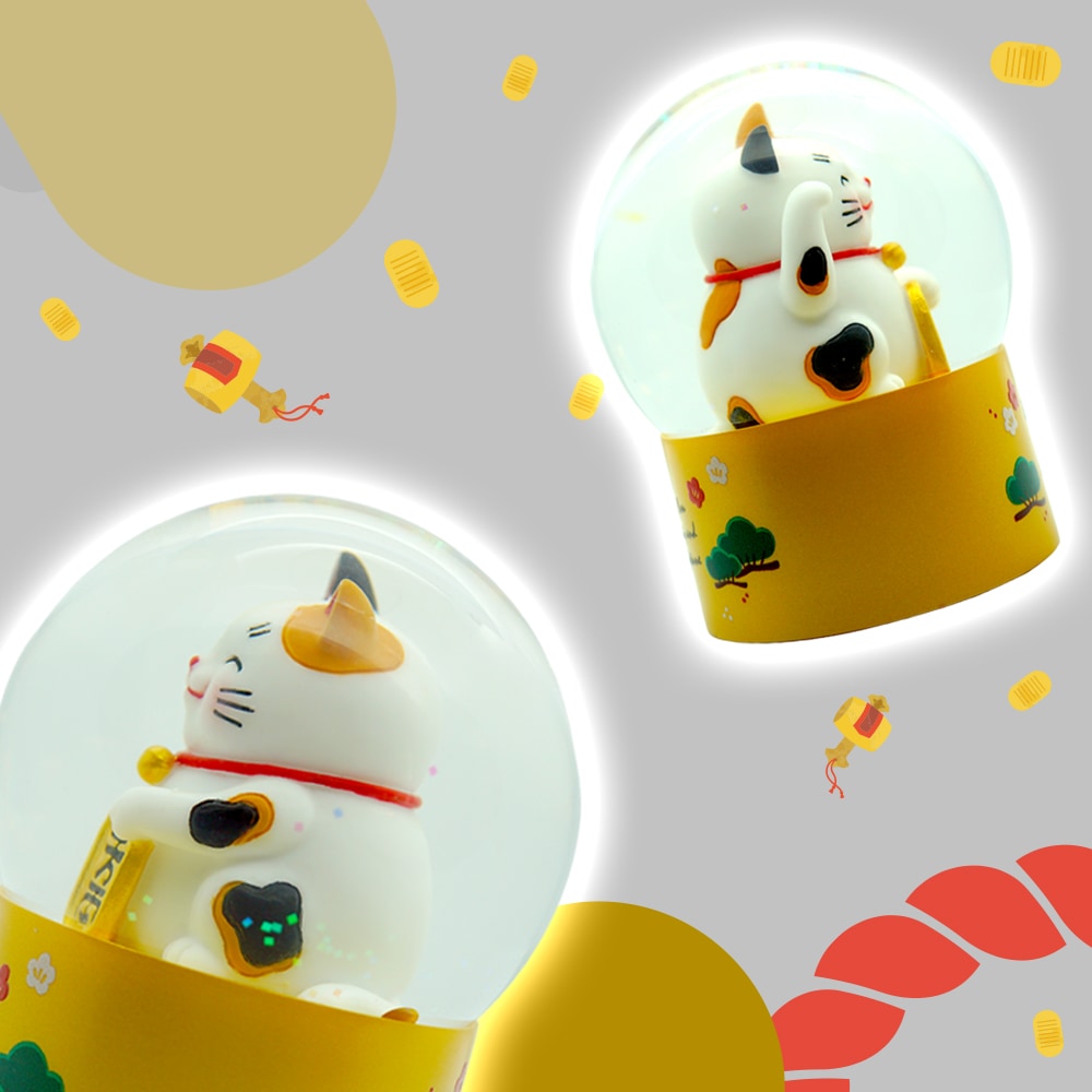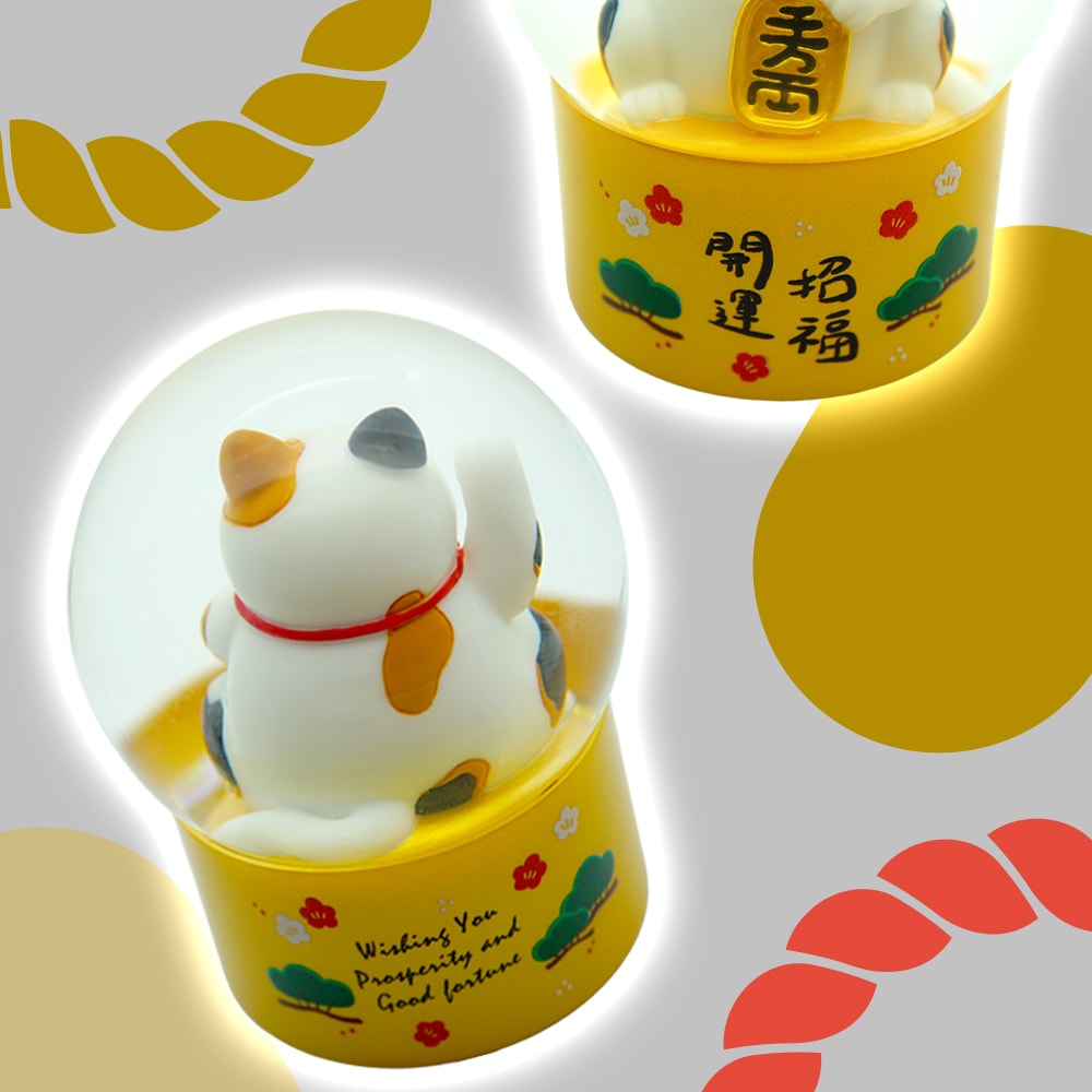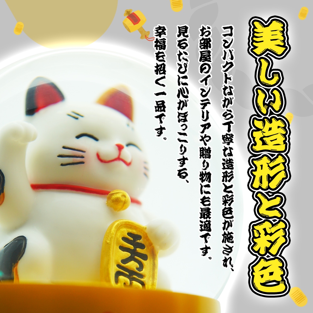 本商品は、小判を抱えた愛らしい招き猫と、金色の“小判型パウダー”が舞う、縁起の良いデザインのスノードームです。揺らすたびにきらめくパウダーが広がり、幸運と福を呼び込むような縁起の良いデザインです。