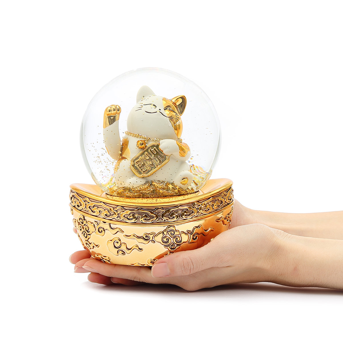 【JARLL】スノードーム 招き猫 オルゴール (ぜんまい式) ライト(バッテリー給電) 回転式 スノーグローブ スノー ドーム 金色 贈り物 置物 DA18078 8251
